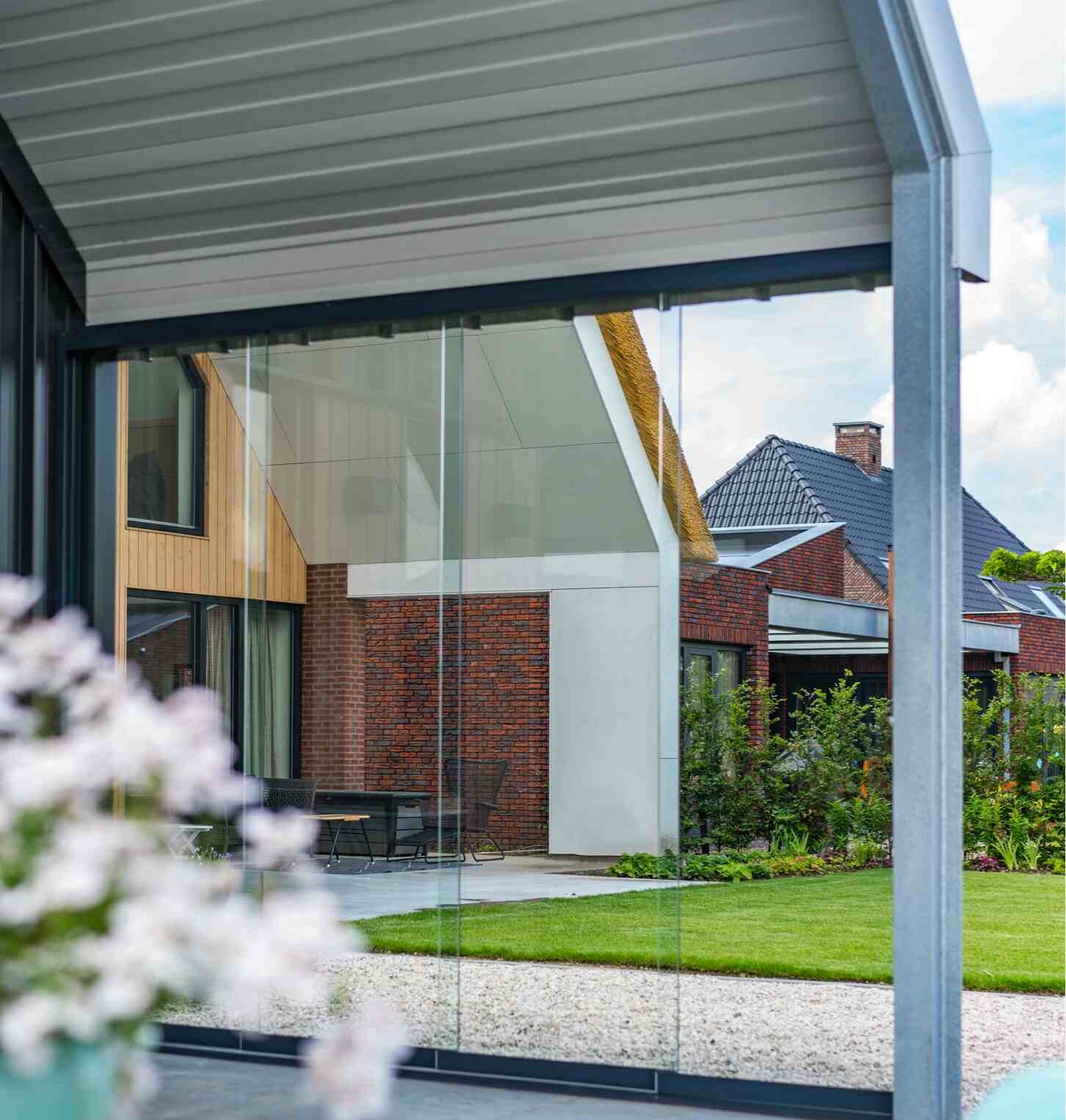 Een glazen schuifwand biedt bescherming tegen weer en wind zonder in te leveren op lichtinval of uitzicht.