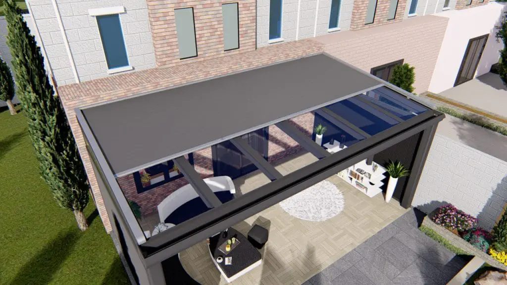 Geniet van de verkoelende schaduw met automatische zonwering boven uw terrasoverkapping.